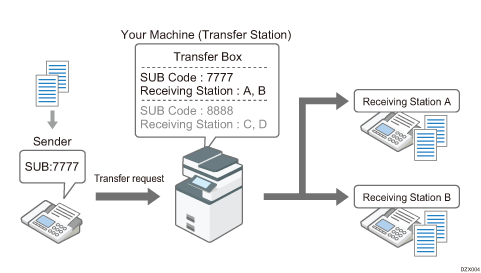When the SUB code specified by the sender and the SUB code in the Transfer Box of the machine match, the machine distributes the received document to the destination registered in Transfer Box by broadcast transmission.