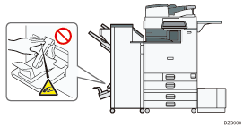 - Lors du fonctionnement de l'appareil, ne placez pas vos mains dans le magasin du finisseur livret ou l'unité d'agrafage du finisseur. Vous pourriez coincer vos doigts dans l'espacement de l'appareil et vous blesser.