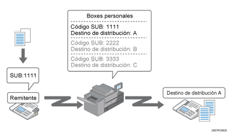 Cuando el código SUB especificado por el remitente coincida con el código SUB de la Personal Box de la máquina, la máquina distribuirá el documento recibido al destino registrado en la Personal Box.