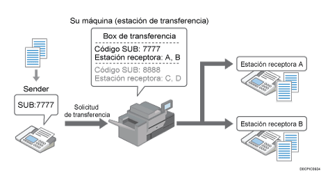 Cuando el código SUB especificado por el remitente y el código SUB del Transfer Box de la máquina coinciden, la máquina distribuye el documento recibido al destino registrado en el Transfer Box mediante transmisión de difusión.