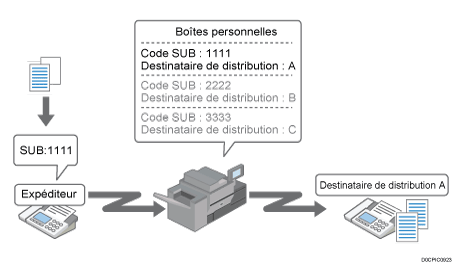 Avant de recevoir un fax dans une Boîte personnelle, indiquez à l'expéditeur le code SUB enregistré pour cette dernière. Le fax reçu est assigné à la Boîte personnelle avec le code SUB correspondant.