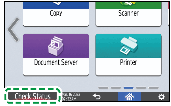If there is a problem such as a paper jam, the [Check Status] indicator lights up or flashes along with a message displayed on the screen. Press [Check Status] to check the status of the machine or application, and resolve the problem accordingly.