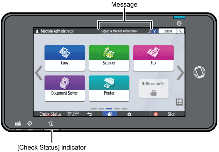 Displays a message indicating the status of the machine or application. Press the message to display it in full text. You can also view more than one message as a list.[Check Status] indicator