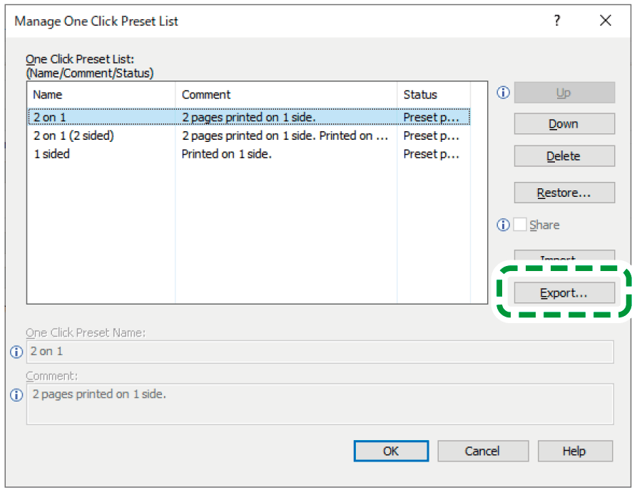Select the settings you want to export from the [One Click Preset List], and then click [Export...].