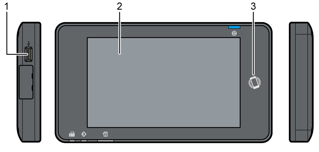 On both sides of the control panel, interfaces for connecting external devices and slots to insert an USB flash memory device are provided.