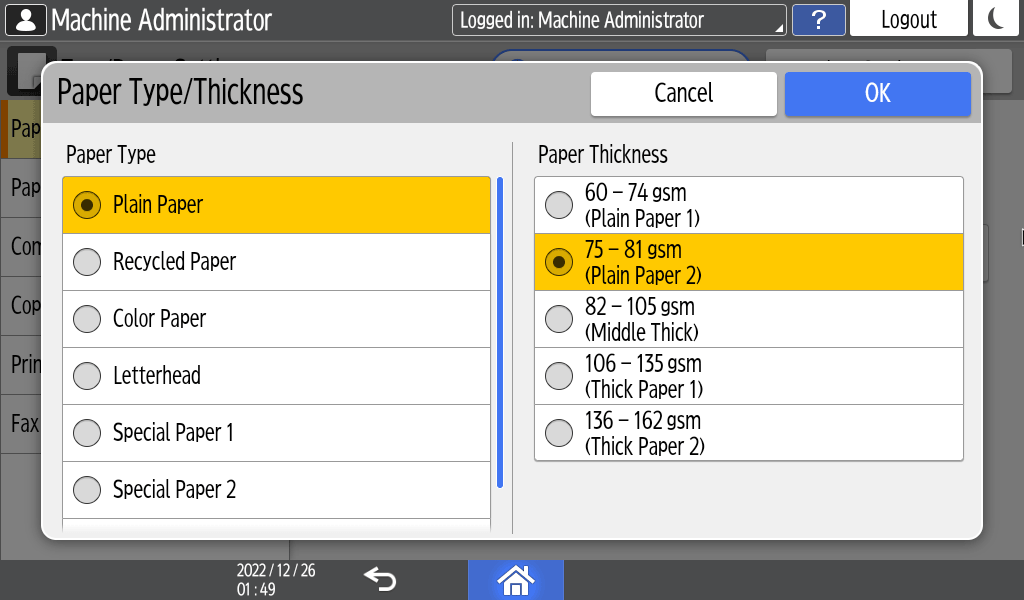 Choose one paper type and paper thickness from the list shown, and then press [OK].