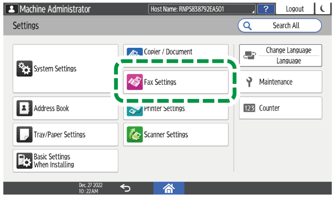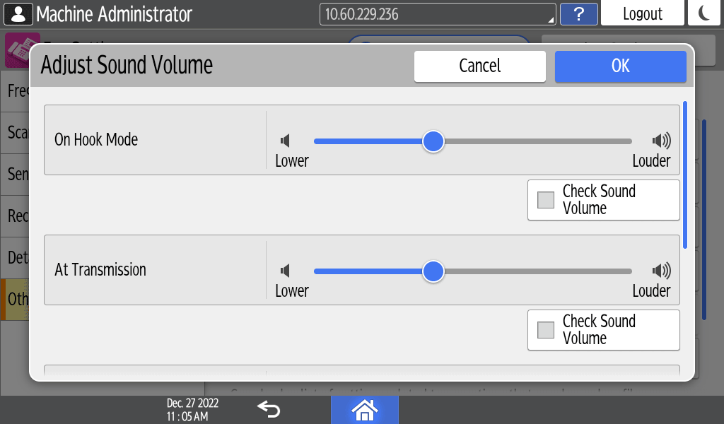 At Dialing: Sound generated between pressing [Start] and connecting to the destination faxPress [Check Sound Volume] to hear the sound volume at the adjusted volume.