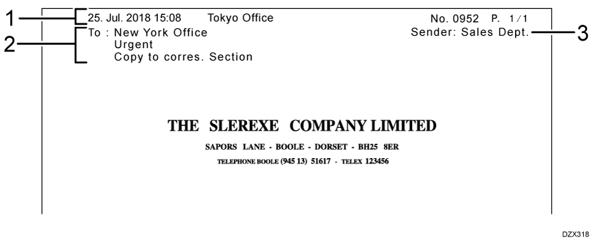 The sender's name, fax number, and e-mail address registered at the origin are printed. This information is printed even if the sender has sent the document while specifying not to print the sender's name (for print) on the document.Reception Time
