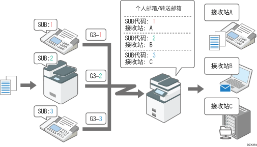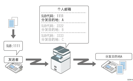 当发件人指定的SUB代码和本机中个人邮箱的SUB代码匹配时,本机会将收到的文档分发到个人邮箱中注册的目的地。