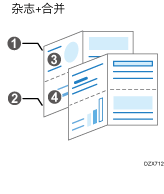 如下图所示,排列四页原稿,并将它们打印在一张纸上。堆叠所有打印页并将它们对折,按照页码的顺序排列页面。