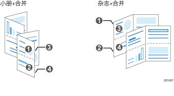 当与装订或中心装订功能结合使用时,您可以将输出页装订成对开页的小册子。