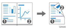 将对开页原稿复印到一张纸上,每面一页(展开双面)。