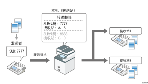 除了在本机上打印接收的传真外,您还可以将它们转发到另一个传真机。通过使用SUB代码,您还可以根据接收传真所用的线路,通过广播传送将传真传送到多个目的地或不同目的地。