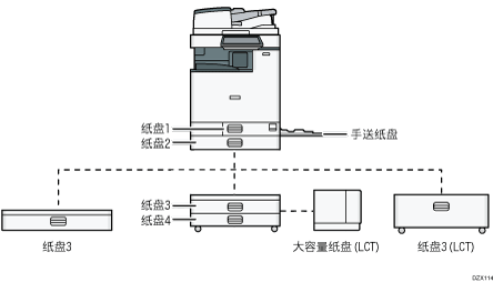 从[纸张类型:纸盘1]至[纸张类型:纸盘4]后[纸张类型:手送台]中选择。