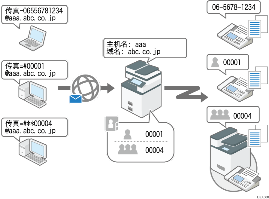 对于指定传送目的地的发件人,在发送电子邮件时,必须在目的地电子邮件地址中指定要将电子邮件内容传送到的机器的主机名和传真号码。
