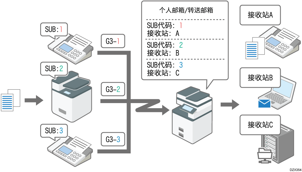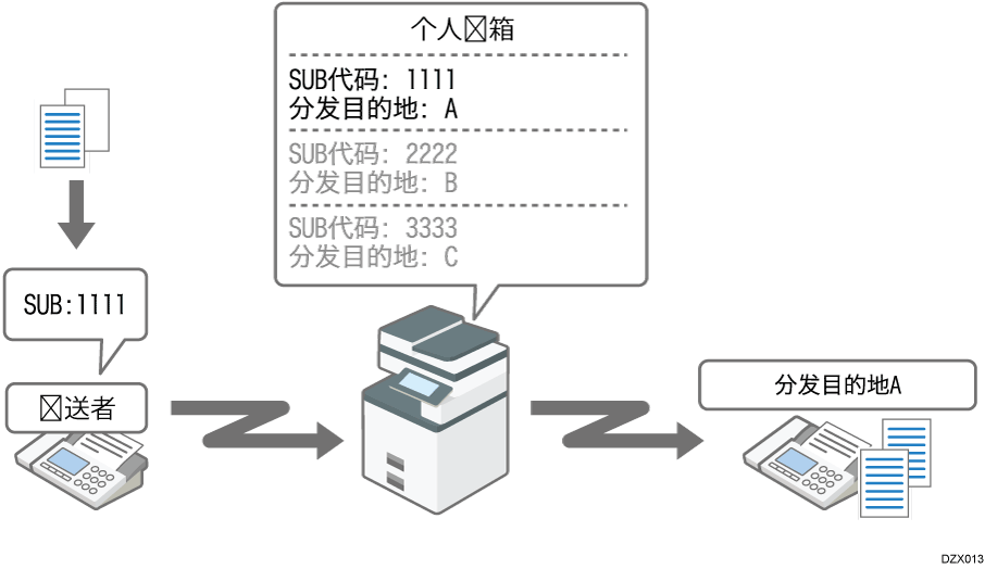 当发件人指定的SUB代码和本机中个人邮箱的SUB代码匹配时,本机会将收到的文档分发到个人邮箱中注册的目的地。
