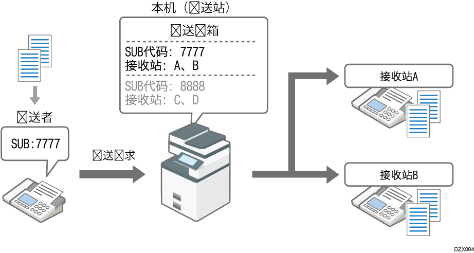 除了在本机上打印接收的传真外,您还可以将它们转发到另一个传真机。通过使用SUB代码,您还可以根据接收传真所用的线路,通过广播传送将传真传送到多个目的地或不同目的地。