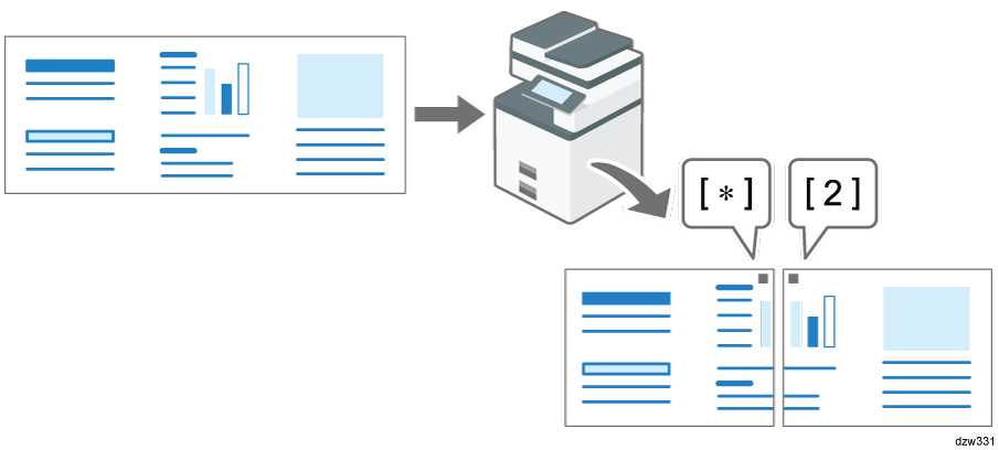 页面被分割并打印在多张纸上。将在页面被分割的位置打印配准标记(*),并且在两张纸上重复打印分割线周围约 10 毫米(0.4 英寸)的区域。当纸张与接收页面的宽度偏差小于 20 毫米(0.8 英寸)时