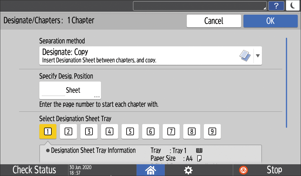 Podeu especificar separacions de fins a 100 ubicacions.Després d'especificar totes les ubicacions per a la designació de capítols, premeu [D'acord] a la pantalla "Designa / Capítols".