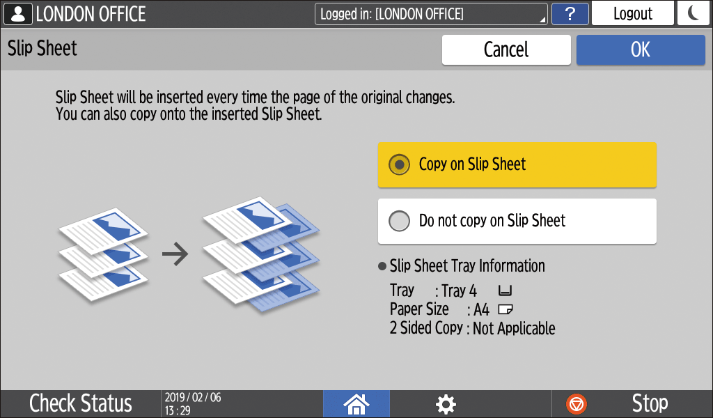 Pel que fa al paper que s'ha d'utilitzar com a separadors, carregueu paper de la mateixa mida i orientació que el paper utilitzat per copiar.Premeu [D'acord].