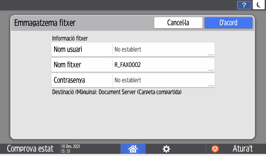 Nom del fitxer: especifiqueu el nom del document escanejat. Si no especifiqueu el nom del fitxer, s'assignarà automàticament un nom com ara "R_FAX0001" o "R_FAX0002".