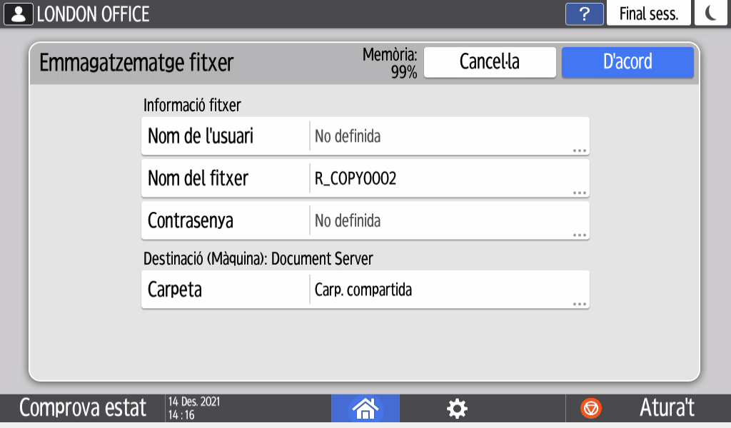 Podeu desar documents al Document Server des de la pantalla de Còpia, Fax o Escàner.