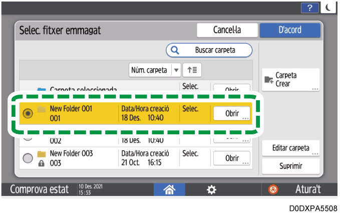 Carpeta: seleccioneu la "Carpeta seleccionada" creada a la configuració predeterminada de fàbrica o una carpeta d'usuari creada per un usuari per emmagatzemar el document. Per seleccionar una carpeta d'usuari, primer heu de crear-la. Si seleccioneu una carpeta protegida amb contrasenya, introduïu la contrasenya i premeu [D'acord].