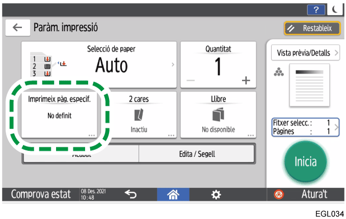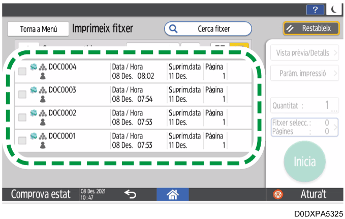 Seleccioneu un document a la pantalla [Imprimir arxiu] i premeu [Vista prèvia/Detalls] per confirmar el contingut del document a la pantalla.