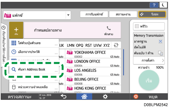 คุณสามารถค้นหาปลายทางในสมุดที่อยู่ของเครื่องและเซิร์ฟเวอร์ LDAP ทั้งหมดที่ลงทะบียนบนเครื่องได้ทันที และสามารถแสดงผลลัพธ์การค้นหาได้สูงสุดถึง 600 รายการ โดยที่ผลลัพธ์สูงสุด 100 รายการจากสมุดที่อยู่ของเครื่องและผลลัพธ์สูงสุด 100 รายการจากเซิร์ฟเวอร์ LDAP แต่ละตัวสูงสุดถึงห้าเซิร์ฟเวอร์