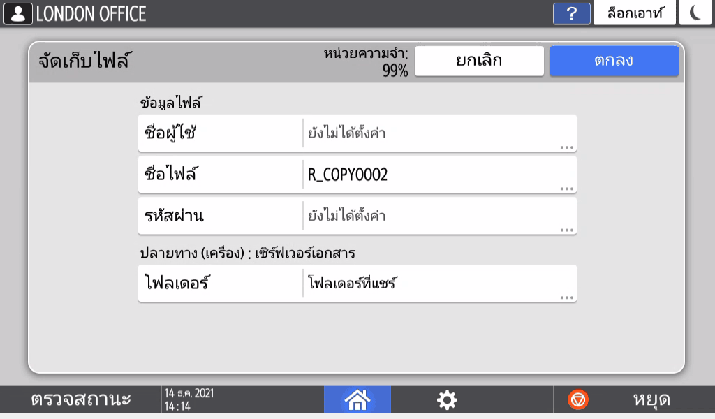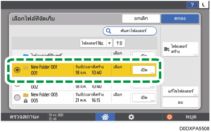 โฟลเดอร์: เลือก "โฟลเดอร์ที่แชร์" ที่สร้างในการกำหนดค่าเริ่มต้นจากโรงงาน หรือ โฟลเดอร์ผู้ใช้ ที่ผู้ใช้สร้างขึ้นเพื่อบันทึกเอกสาร หากต้องการเลือก User Folder ให้สร้างโฟลเดอร์ไว้ก่อน หากเลือกโฟลเดอร์ที่ป้องกันด้วยรหัสผ่าน ให้ป้อนรหัสผ่าน จากนั้นกด [ตกลง]