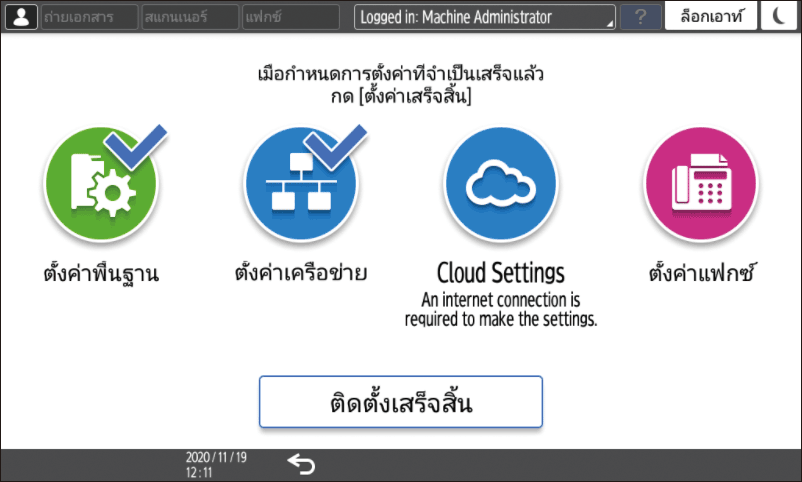 คุณสามารถใช้ [Cloud Settings] เมื่อ [ตั้งค่าพื้นฐาน] และ [ตั้งค่าเครือข่าย] เสร็จสมบูรณ์ใน [การตั้งค่าการติดตั้ง]
