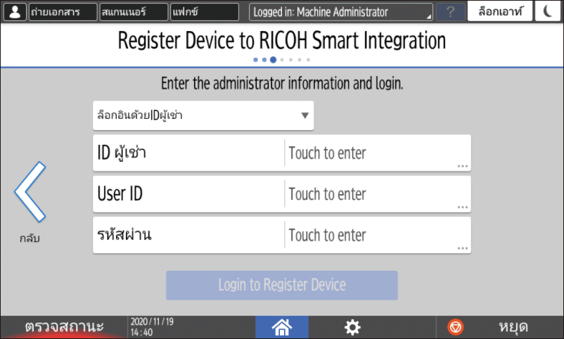 ล็อกอินเข้าสู่ระบบ RICOH Smart Integration ในฐานะผู้ดูแลระบบผู้เช่า และบันทึกเครื่อง
