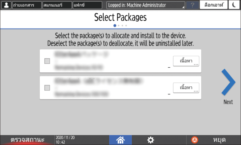 ติ๊กเครื่องหมายแพ็กเกจที่จะจัดสรรให้กับเครื่องและนำเครื่องหมายถูกออกจากแพ็กเกจที่จะยกเลิกการจัดสรร แล้วกด [ถัดไป]