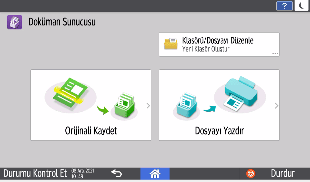 Simge Ana ekranda görünmüyorsa, simgeyi uygulama listesi ekranından ekleyin.Doküman sunucusu ekranında [Orijinali Kaydet] öğesine basın.
