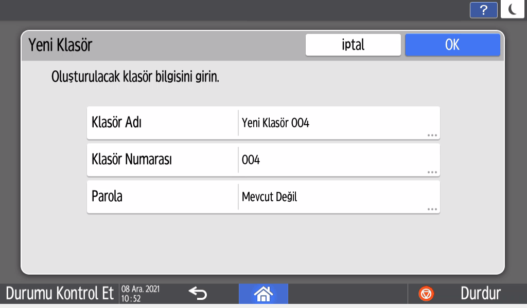 Parola: Klasöre erişmek için girilmesi zorunlu olacak bir parola belirleyin. Parola, 4 ila 8 haneden oluşan bir sayı olmalıdır. Parola korumalı bir klasör söz konusu olduğunda