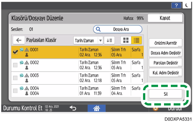 olarak değişir.Sil: Klasörü siler. Bir klasörü sildiğinizde, klasörün içindeki tüm belgeler silinir.