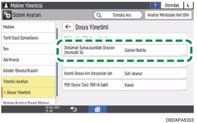 Fabrika ayarında, doküman sunucusunda kaydedilen belgeler üç gün (72 saat) sonra otomatik olarak silinir. Belgelerin silindiği süreyi değiştirebilir ya da belgelerin otomatik silinmemesini ayarlayabilirsiniz.