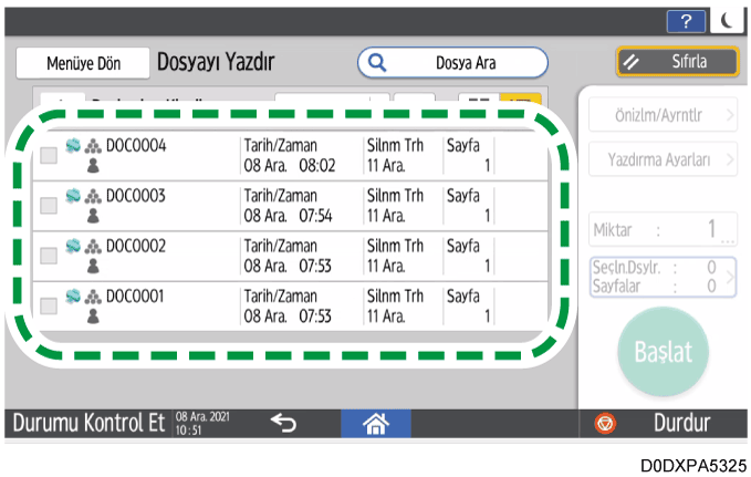 [Dosya Yazdır] ekranında bir belge seçin ve belgenin içeriğini ekranda doğrulamak için [Önizle/Ayrıntılar] öğesine basın.