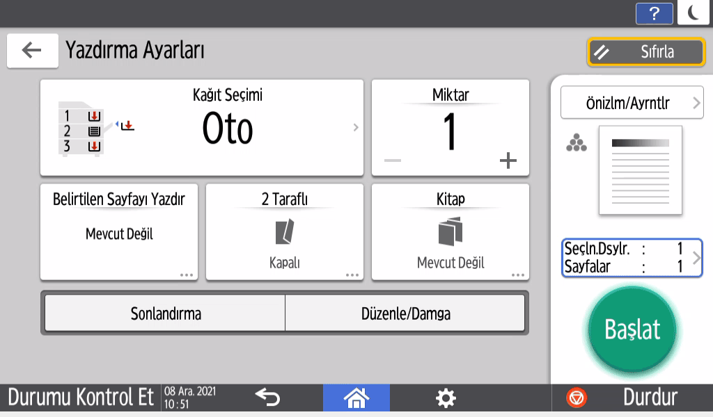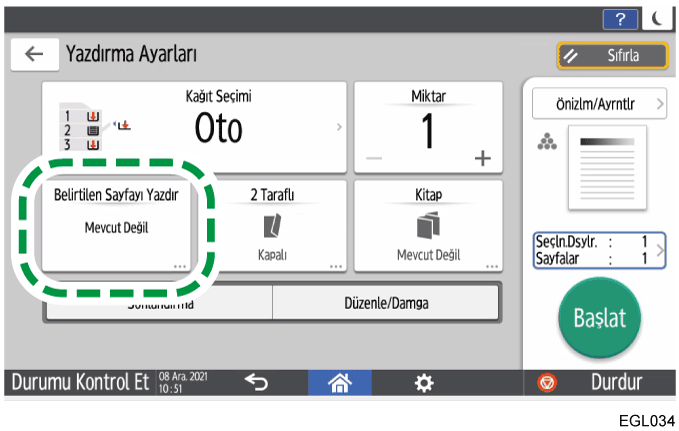 Tepsiyi Seç: Yazdırma için kullanılacak kağıt kasetini seçin.