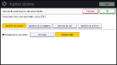 Para especificar la autenticación del administrador, establezca "Gestión de autenticación del administrador" en [Activado]. Con este ajuste, los administradores podrán configurar únicamente los ajustes que se les hayan asignado.
