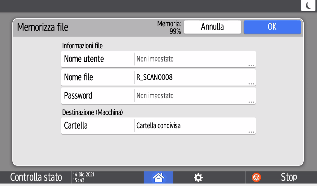 Nome file: specificare il nome del documento scansionato. Se non si specifica il nome del file, sarà assegnato automaticamente un nome nel formato "R_SCAN00001" o "R_SCAN00002".
