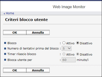 Selezionare [Attivo] per annullare il blocco dopo un intervallo di tempo specificato, quindi inserire il valore desiderato in "Blocca utente per" fino a 9999 minuti (circa sette giorni).