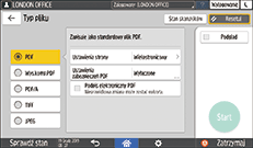 Oprócz normalnego formatu PDF można wybrać także format [Wys.komp.PDF], w którym następuje zmniejszenie rozmiaru pliku przy zachowaniu czytelności, lub format [PDF/A] zgodny z międzynarodową normą i nadający się do długotrwałego przechowywania.