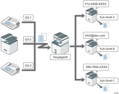 Sie können das Sub-Gerät, auf dem ein empfangenes Fax gedruckt werden soll, in den Einstellungen des Hauptgeräts festlegen.