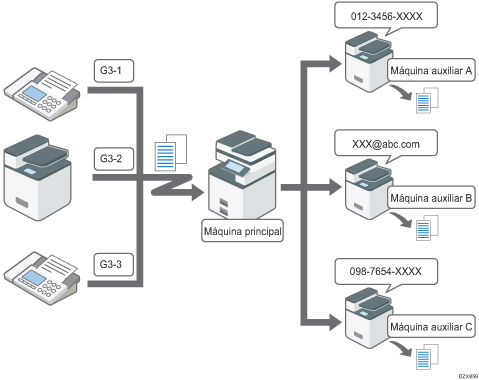 Puede especificar la máquina secundaria en la que se imprimirá un fax recibido en los ajustes de la máquina principal.