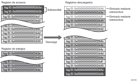 Si se supera el límite del número de registros que pueden almacenarse en la máquina y se generan nuevos registros, los nuevos sobrescribirán los registros antiguos. Si los registros no se descargan periódicamente, puede que no sea posible conservar los registros antiguos en archivos.