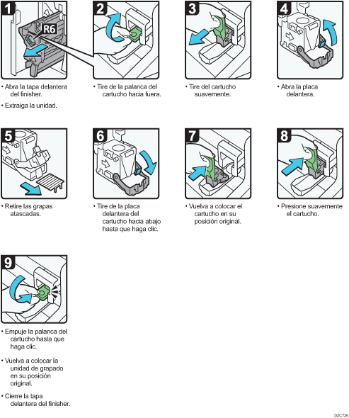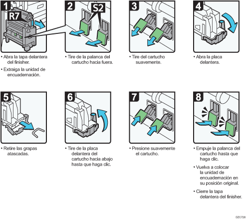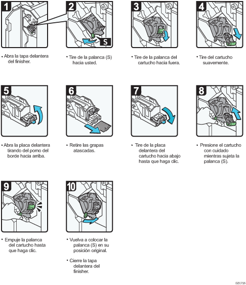 Para retirar una grapa atascada, consulte la descripción dentro de la tapa del finisher (excepto en el Internal Finisher SR3250).