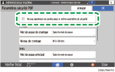 Appuyez sur [Paramètres de sécurité PDF] et configurez les paramètres de sécurité.