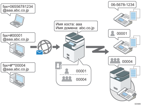 Формат: факс=#(регистрационный номер)@(имя хоста аппарата).(доменное имя)