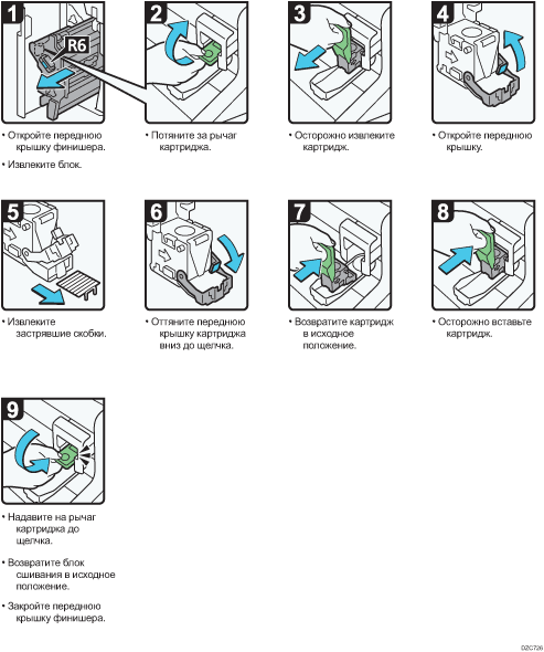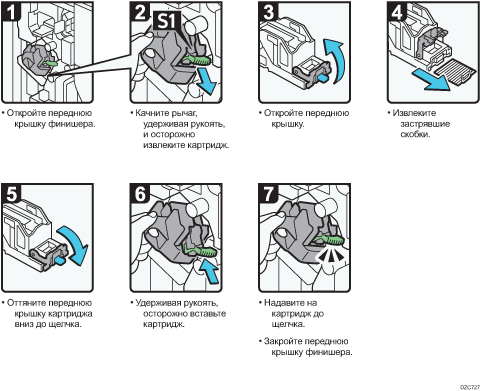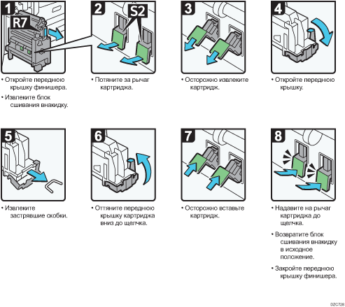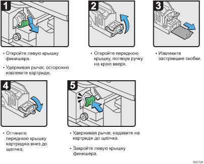 При удалении застрявшей скрепки см. описание процедуры внутри крышки финишера (кроме внутреннего финишера модели SR3250).